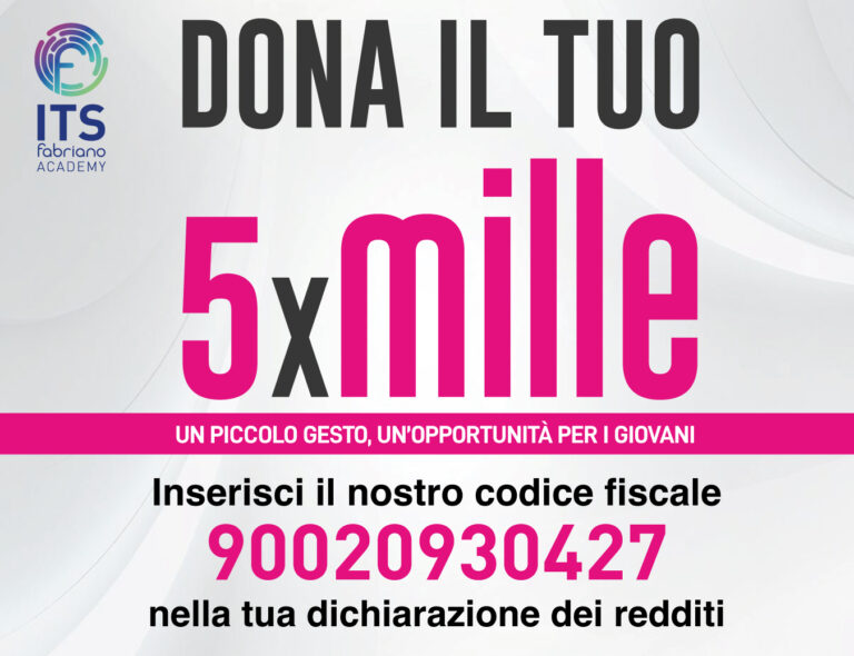 Scegliere a chi destinare il proprio 5×1000 è un gesto semplice, ma di grande valore. Sostenendo ITS Fabriano Academy, contribuisci alla formazione di giovani talenti