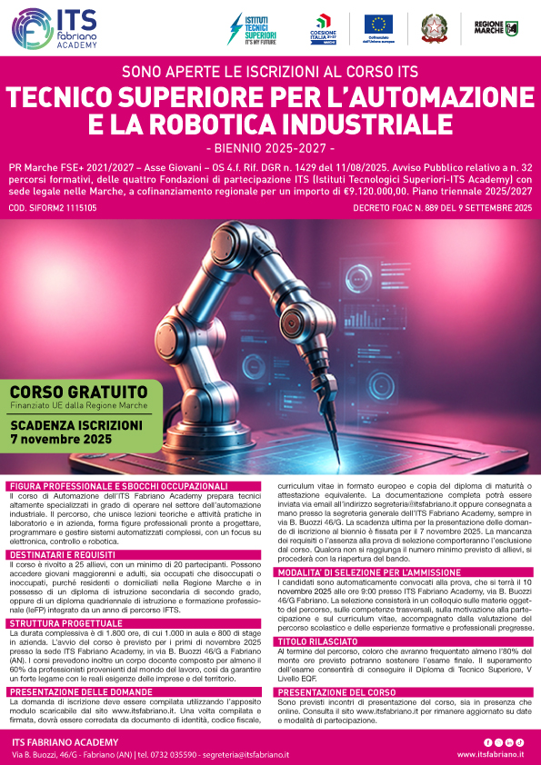 Il corso di Automazione dell’ITS Fabriano Academy prepara tecnici altamente specializzati in grado di operare nel settore dell’automazione industriale. Il percorso, che unisce lezioni teoriche e attività pratiche in laboratorio e in azienda, forma figure professionali pronte a progettare, programmare e gestire sistemi automatizzati complessi, con un focus su elettronica, controllo e robotica.